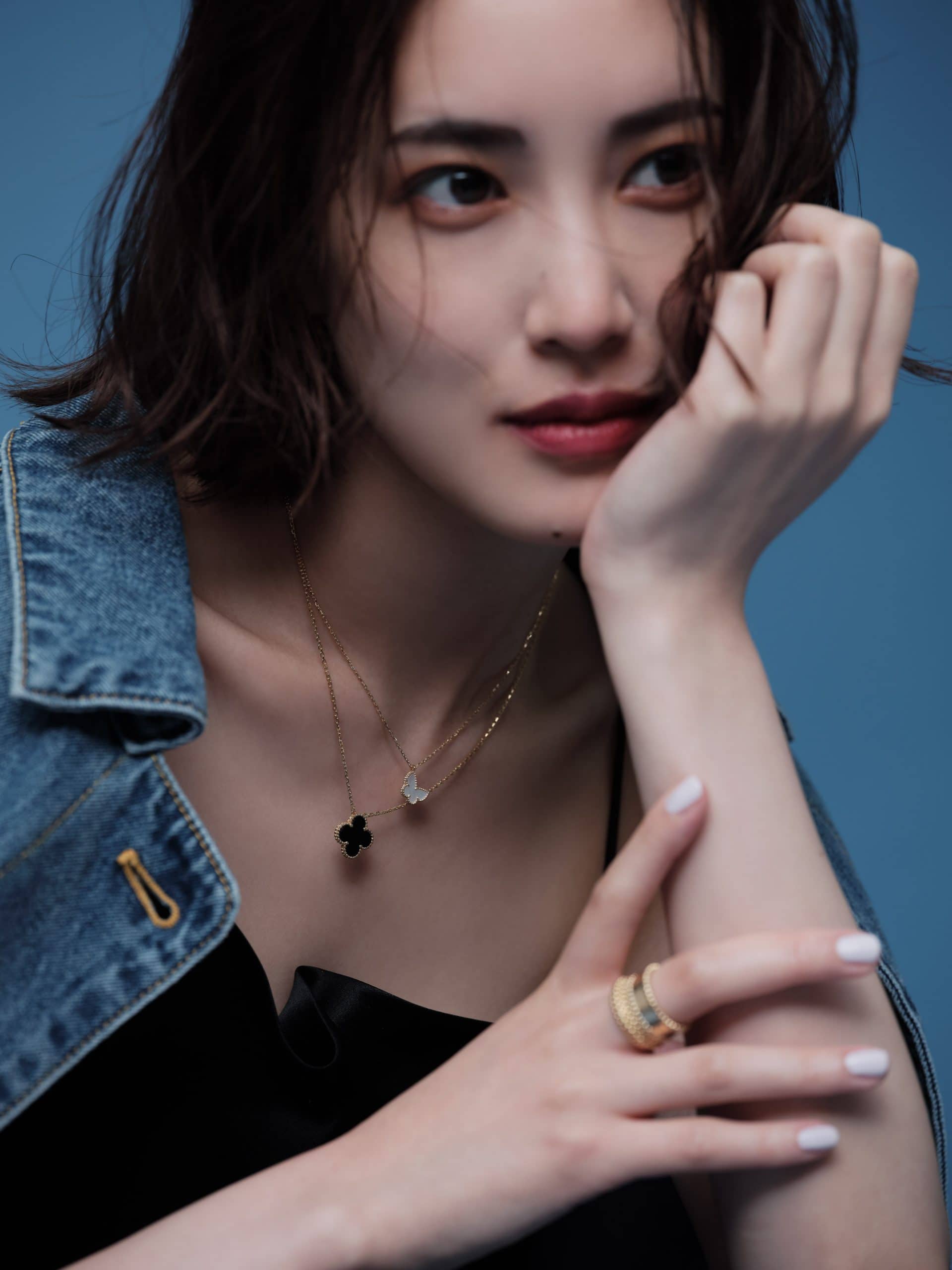 ペンダント上「スウィート アルハンブラ パピヨン」¥221,100下「ヴィンテージ アルハンブラ」¥401,500リング上「ペルレ シニアチュール」¥379,500下「ペルレ ゴールドパール 3連モデル」¥418,000(すべてヴァン クリーフ&アーペル/ヴァン クリーフ&アーペル ル デスク)ジャケット¥33,000(ケラウズランブラ/JACK of ALL TRADES press room)キャミソール¥15,000(バナナ・リパブリック)