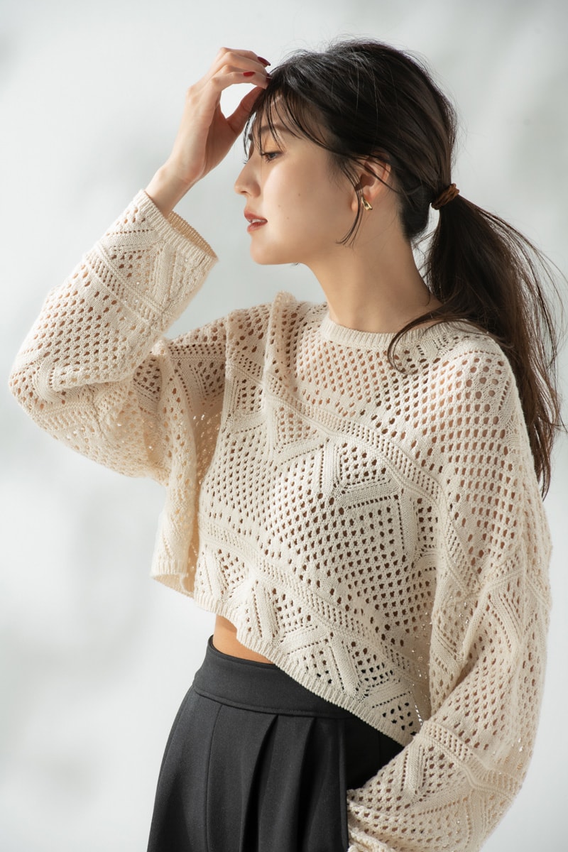 リラクシーに着こなしたいざっくり編み地のクロシェニット