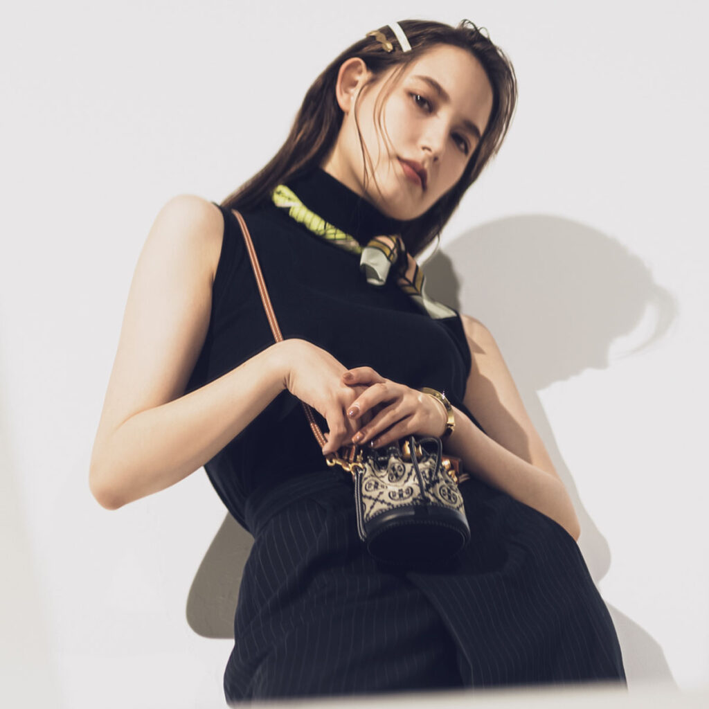 アクセ感覚のちびバッグが気分!バッグ¥44,000 スカーフ¥25,300(ともにトリー バーチ/トリー バーチ ジャパン)ゴールドバレッタ¥6,900(Mrs.President&Co/ヘアアクセサリーニューヨーク)バレッタ¥7,920(フランス ラックス/ピーアンド ティートレーディング)バングル¥28,600(ワンエーアールバイウノアエレ/ウノアエレ ジャパン)ニット¥22,000(スローン)パンツ¥41,800(Uhr)