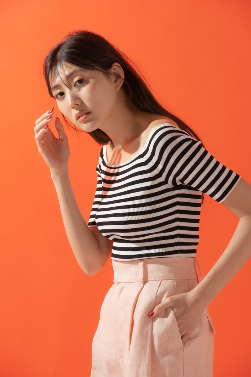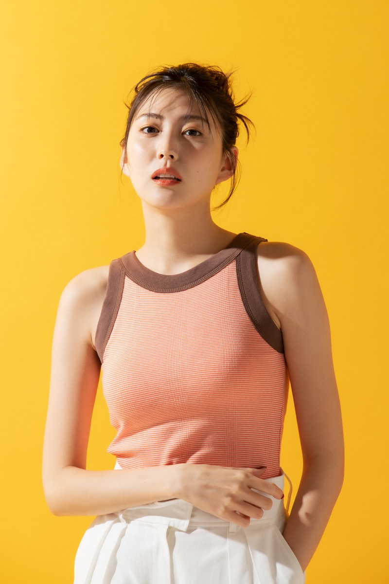 ボーター使いとパイピングが可愛い夏の仕様の主役タンクトップ。やわらかなリブのタンクなので、生地感がパリっとしたワイドパンツでゆるピタラインのメリハリをつけて。太いベルトデザインでウエストマークすればワンツーコーデが地味見えしません。