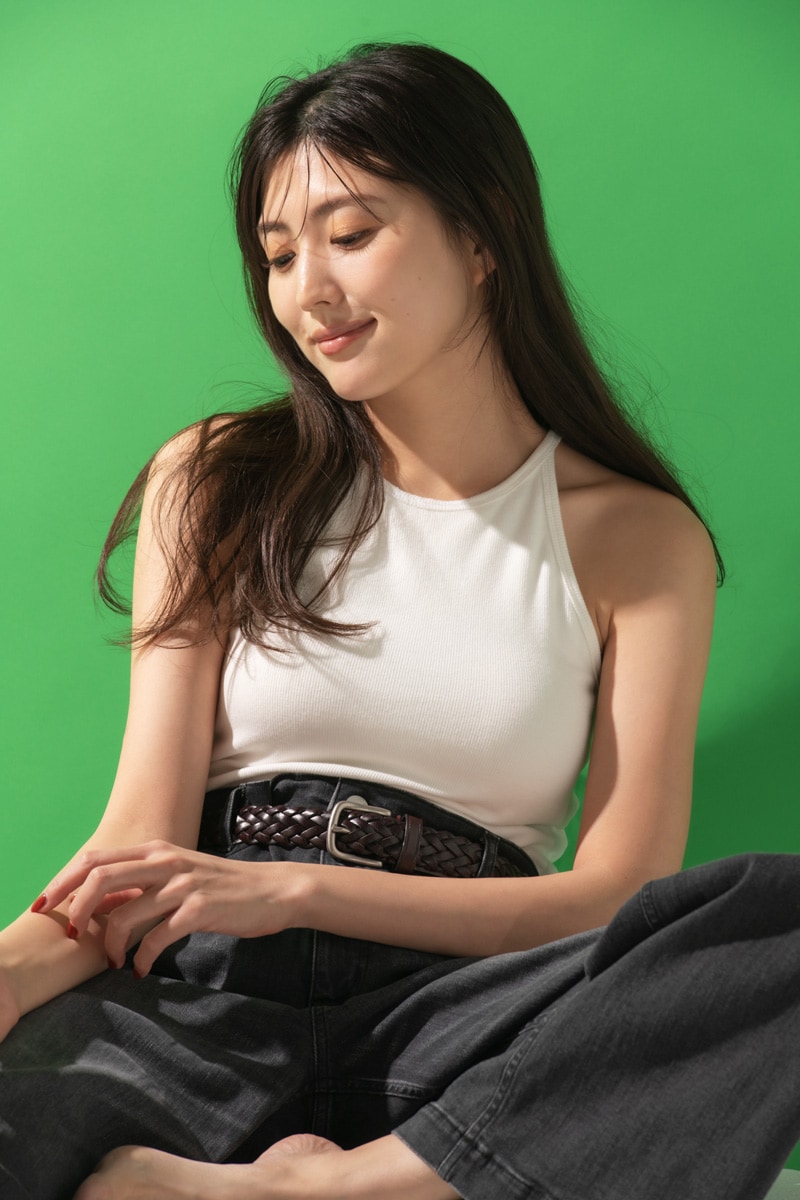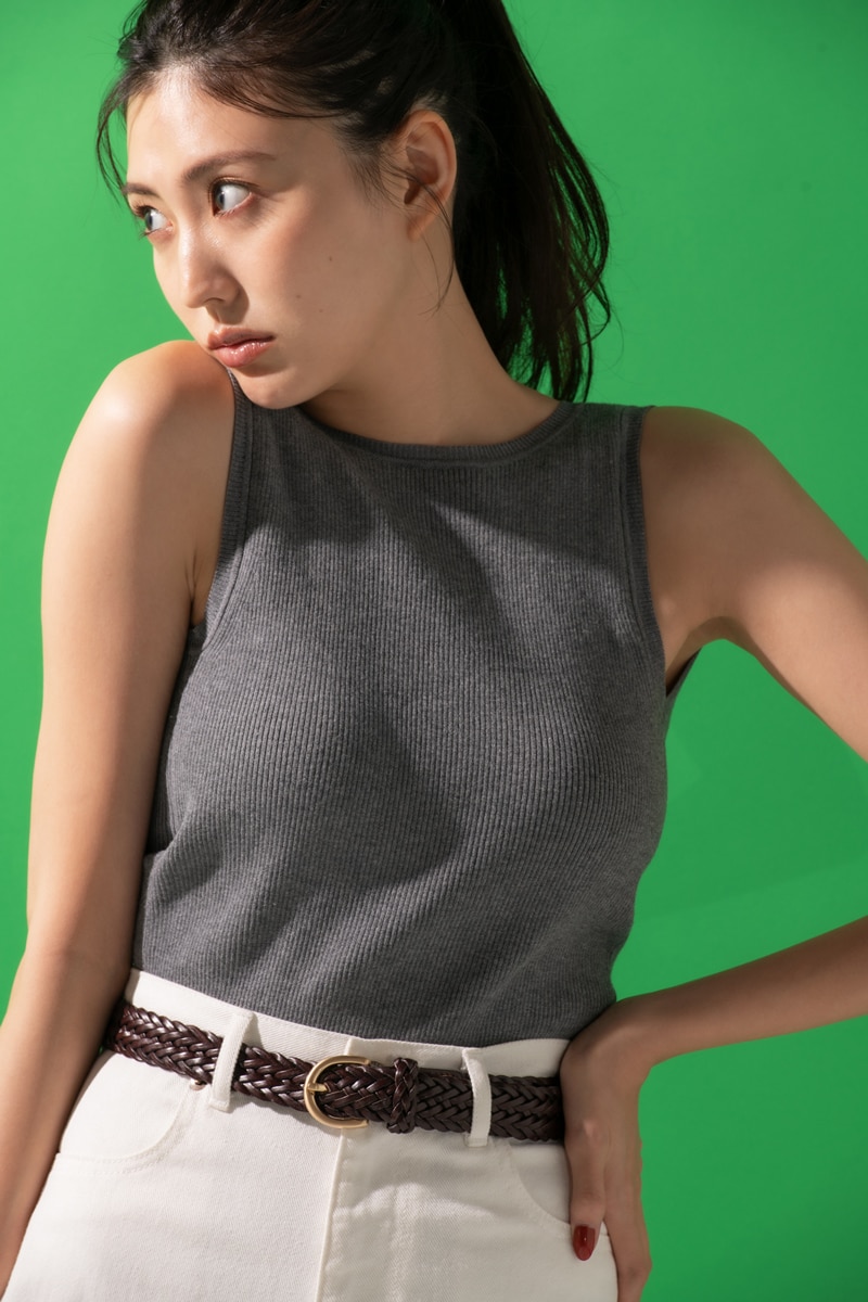 ネックはつまり気味でアームホールはすっきりと、さらに背中開きデザインと絶妙に今っぽいニットリブトップス。カップ部分に安定感があって着用感がいいのが自慢です。きれいめになりすぎないように白のデニムベルトで立体感をつければ完璧夏コーデが完成!
