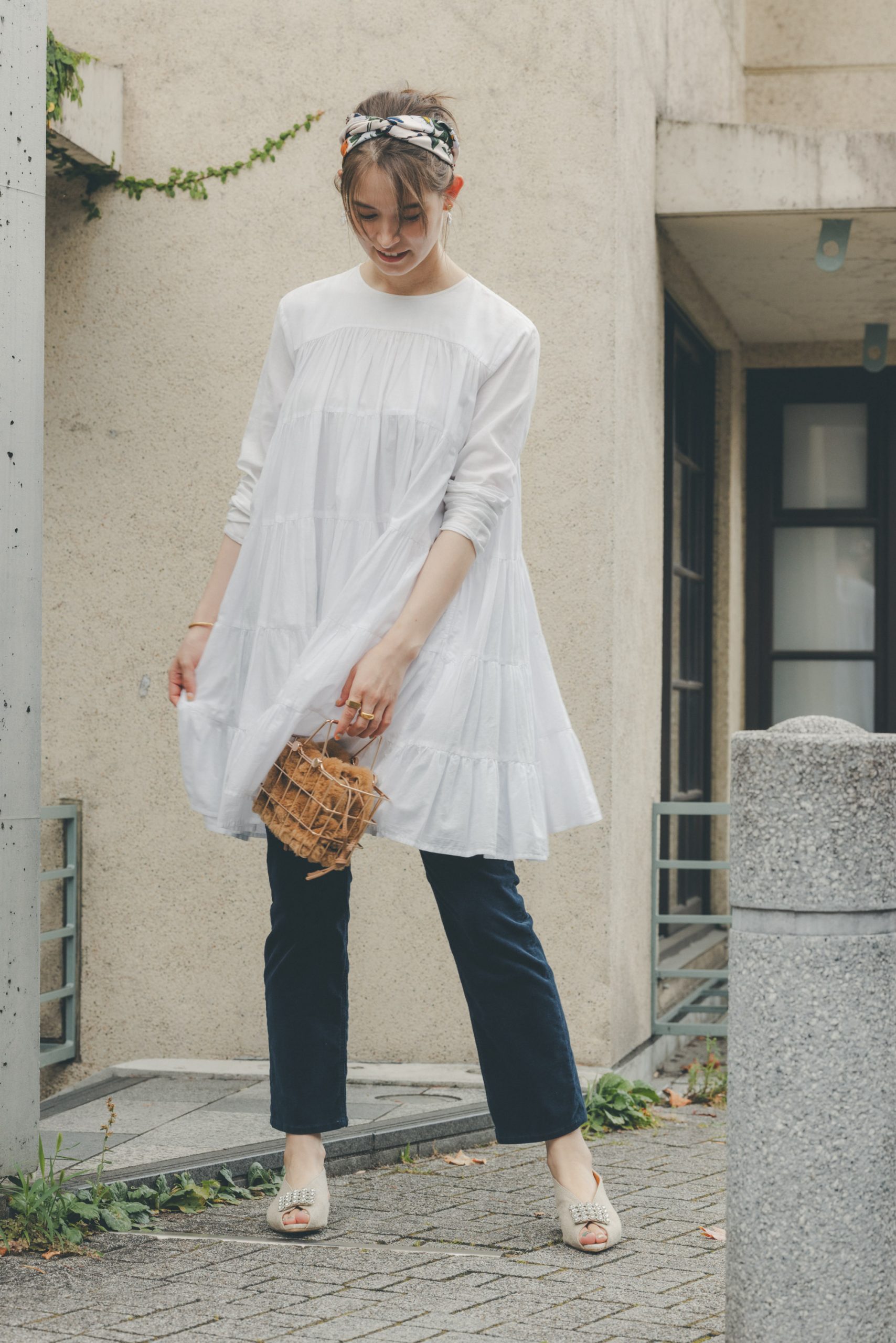 ブラウス¥39,600(コラム/エストネーション)パンツ¥3,990(UNIQLO)バッグ¥147,400(トリー バーチ/トリー バーチ ジャパン)手に持ったジャケット¥39,600(ダイアグラム/Diagram 表参道ヒルズ店)靴¥34,100(PIPPICHIC/RHC ロンハーマン)カチューシャ¥28,600(アレクサンドル ドゥ パリ/アレクサンドル ドゥ パリ GINZA SIX店)イヤカフ¥7,150(ステラハリウッド)ネックレス¥55,000(ココシュニック)リング¥132,000(エナソルーナ)