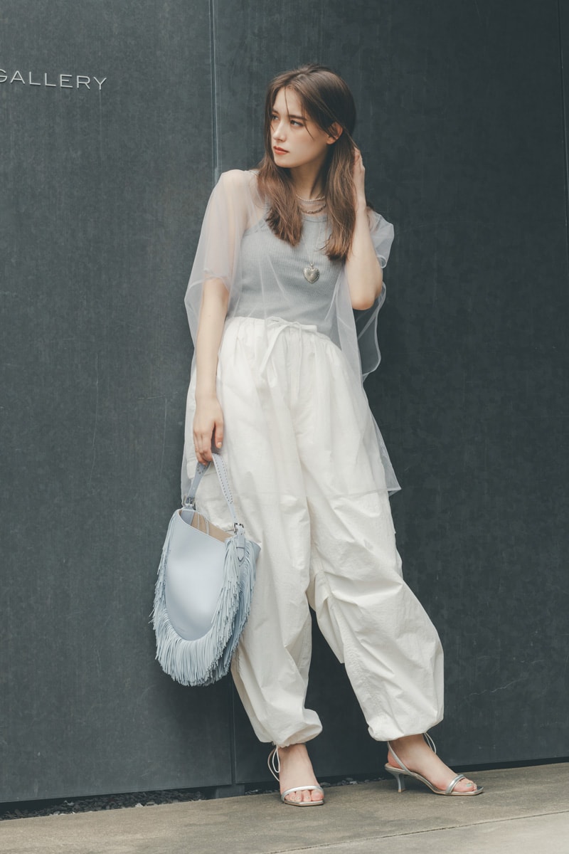 着痩せも叶えたいけど、上級者コーデも楽しみたい人には、透け感で作るメリハリコーデをレコメンド。足首のほっそりさを強調してくれる裾絞りのワークパンツは、1枚でスタイルアップを叶える優秀アイテム。透け感のあるチュールトップスをプラスすることで、さりげなく腕まわりをカモフラージュしつつ、圧倒的トレンド感も手に入ります。ふわっとした素材のトップスでも、コーデがぼやっとしないポイントは、ボリューム感に強弱をつけてメリハリを作ること!
