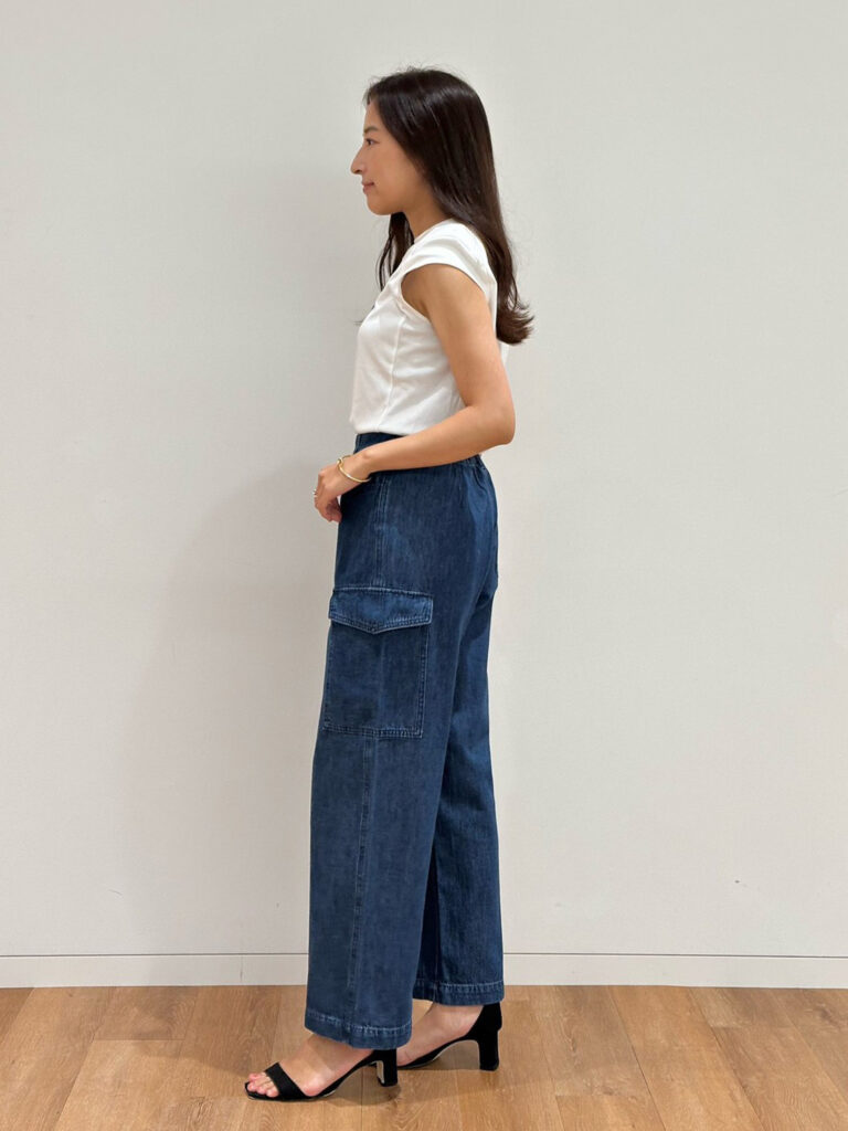 珍しいデニム地のカーゴパンツ。普段のジーンズと同じ感覚でスタイリングができるので、デニムスタイルに変化をつけたい方におすすめです。サイドポケットがボトムスの物足りなさを埋めてくれるので、シンプルなトップスと合わせても好バランスに仕上がります。