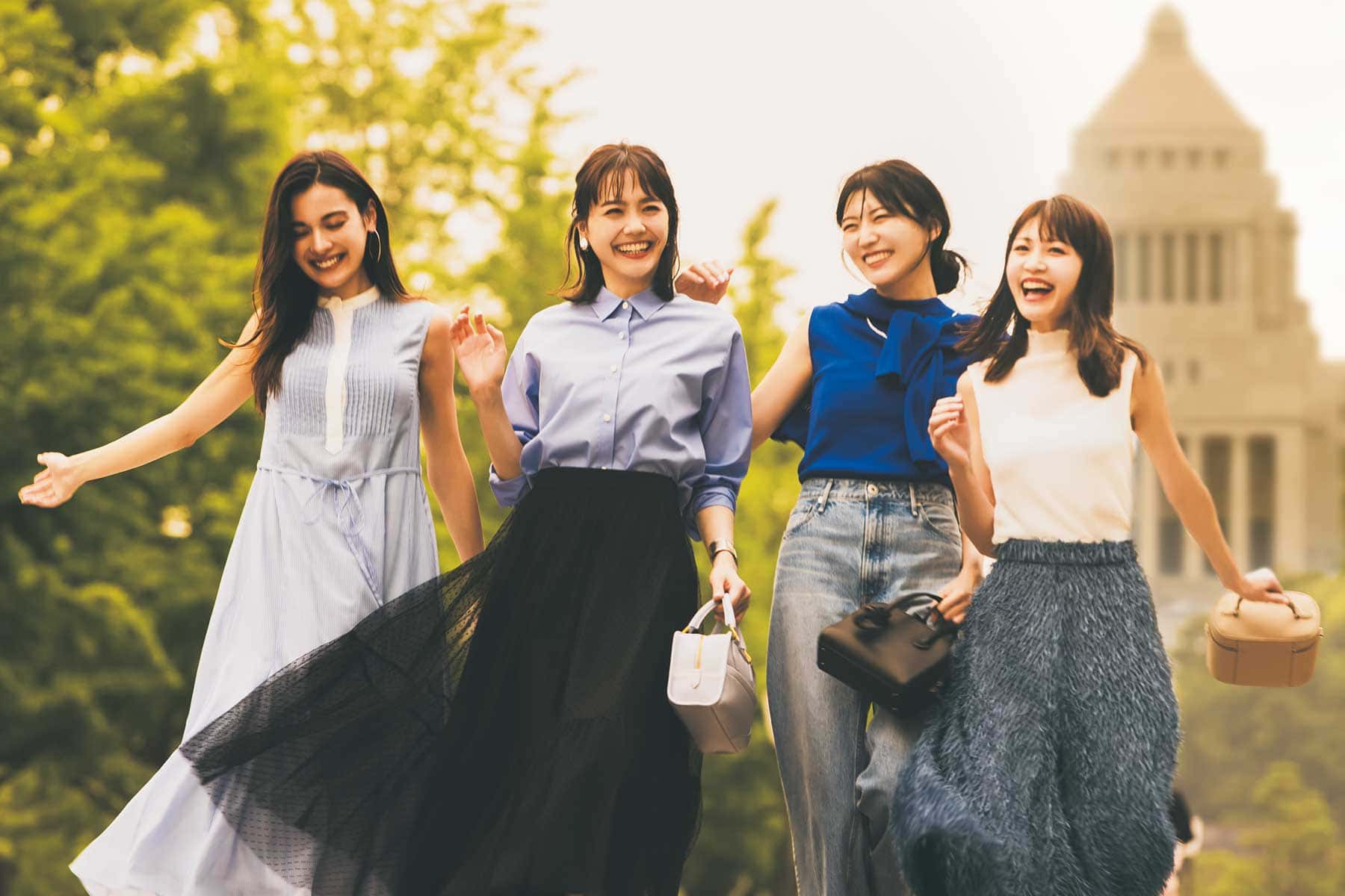 【アイリ】バッグ¥198,000(J&M デヴィッドソン/J&M デヴィッドソン カスタマーセンター)イヤリング¥3,150(アビステ)バングル¥69,300(シンパシーオブソウルスタイル/フラッパーズ)【マミ】ニット¥13,200スカート¥26,400(ともにカデュネ)バッグ¥110,000(ボナベンチュラ)【ナミ】アンサンブル¥15,400(アルページュストーリー)デニムパンツ¥27,500(アッパーハイツ/ゲストリスト)バッグ¥44,000(VASIC/ヴァジックジャパン)ネックレス¥39,380(アルポ/ZUTTOHOLIC)【エミリ】ワンピース¥20,900(CELFORD)ピアス¥10,780(チビ・ジュエルズ/チビジュエルズ・ジャパン)