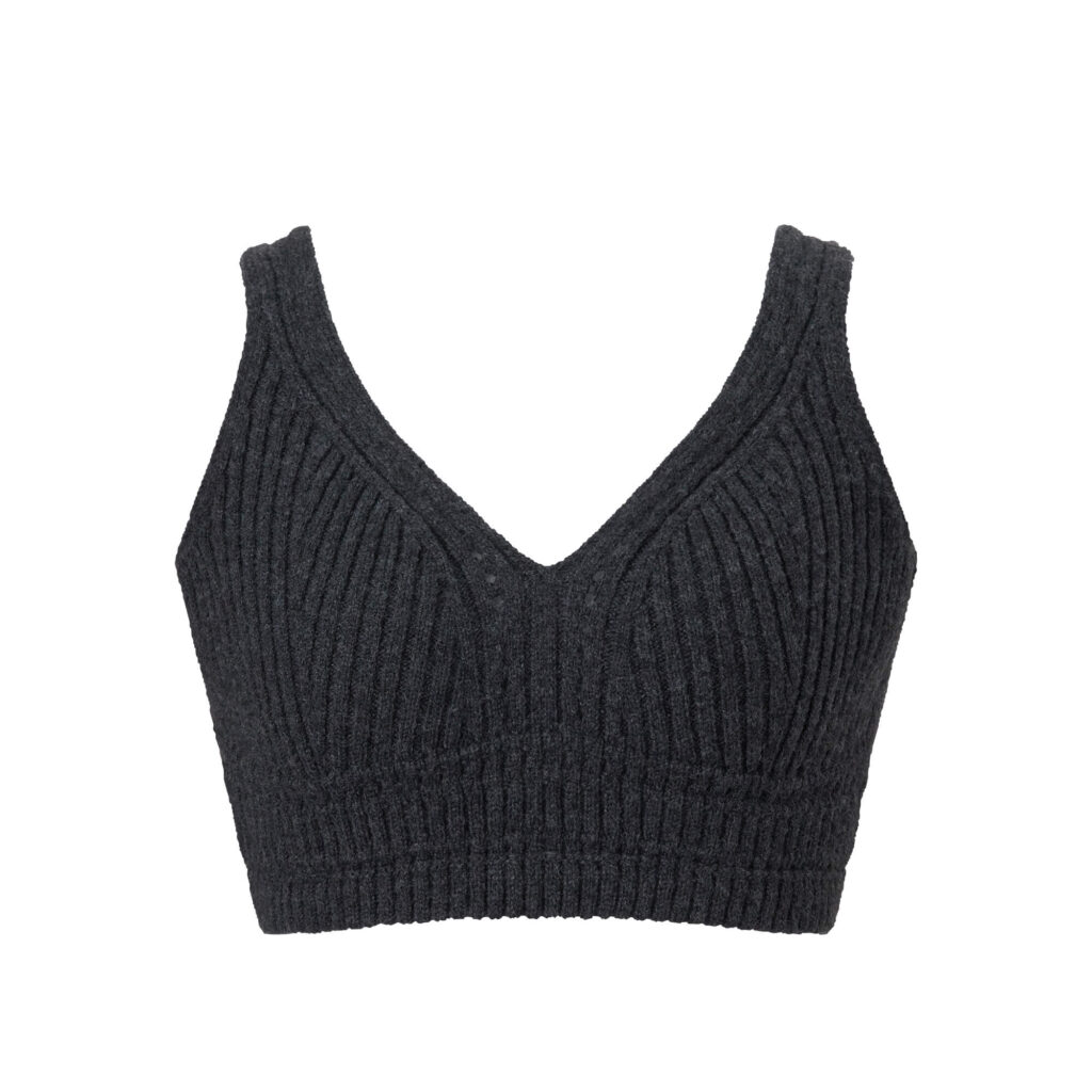 大きく開いたニットブラの襟元は、絶妙なカーブがオシャレ。ニットに縁取られたパイピングと、スリーブに刻まれたリブが、ボディを立体的に見せてくれます。
