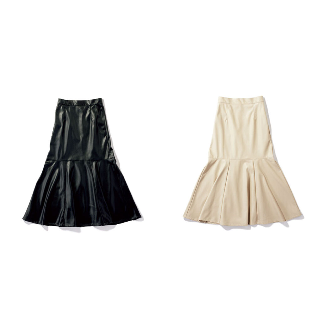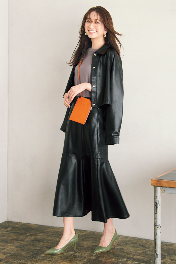 『上品なショート丈ジャケットに細見えマーメイドスカートと、女性らしく着られるシルエットにこだわったエコレザーアイテム。上下それぞれ着回しが利くので秋冬コーデの幅も広がります。』