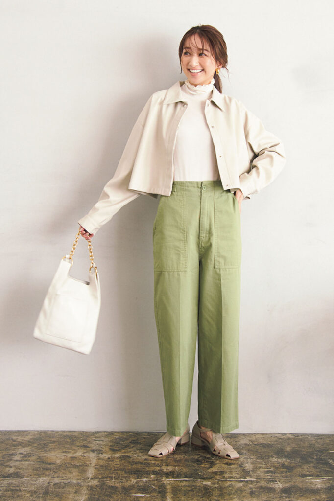 シンプルコーデがぐっとスタイルアップ。エコレザージャケット¥17,600パンツ¥12,100(ともにユニバーサル オーバーオール/買えるCLASSY.)カットソー¥990(GU)バッグ¥37,400(オルセット/オルサ)サンダル¥37,400(ファビオ ルスコーニ/ファビオ ルスコーニ ジェイアール名古屋タカシマヤ店)イヤリング¥6,300(アビステ)