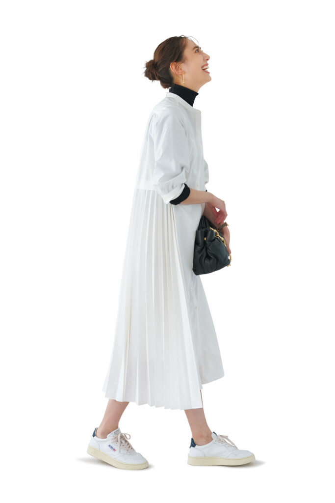 きちんと感高めだからこそ、パンプスだとトゥーマッチになりがちな白シャツワンピ。ネイビーが効いたスニーカーで大人っぽさを死守しつつ、ラフさをMIXすれば気張って見えない。