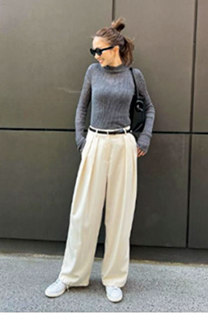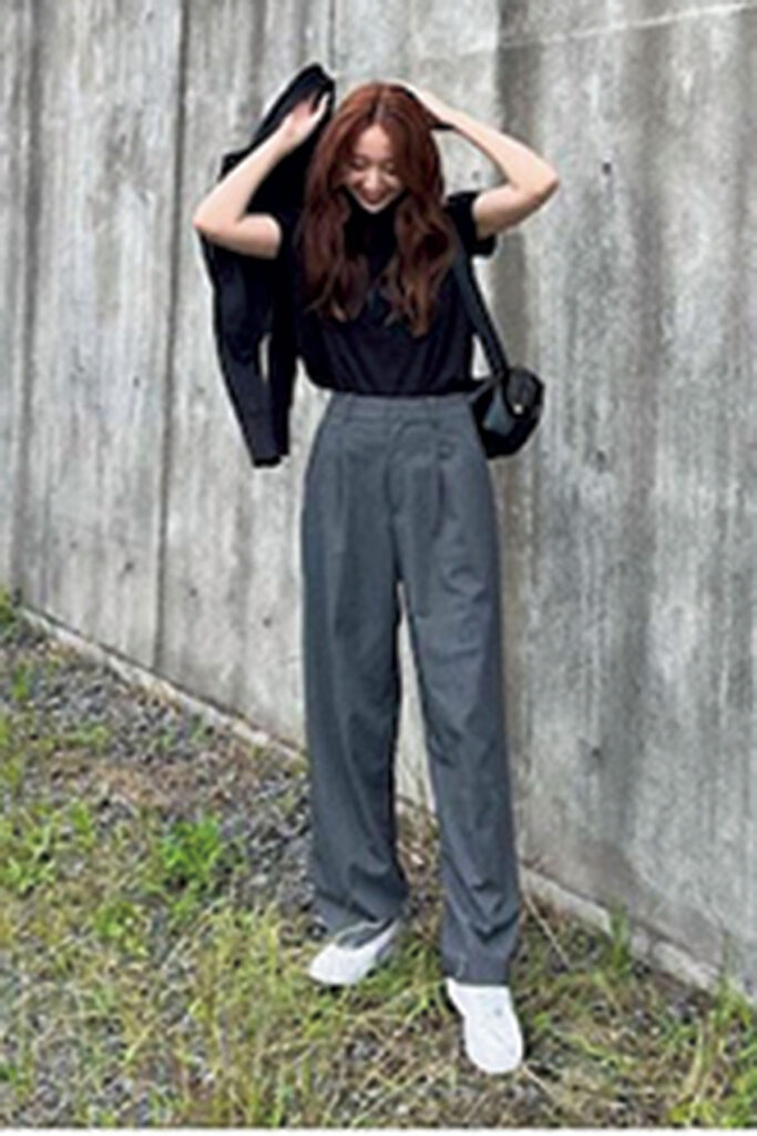 スニーカーコーデは、スポーティになりすぎないようにしています。きれいめ服に抜け感を出したくて使うことが多いかな。そしてスタイルアップはマスト!上下オーバーサイズ×スニーカーだとメンズっぽくなるので、トップスはコンパクトで、ボトムスはハイウエストに。そこにスニーカーを合わせて、足元を重めにするのが好きです。色ごとになんとなく使い道を変えていて、白スニーカーはラフさを足したいとき。いろんなシーンに使えるので万能ですね。黒は全体のバランスをキュッとまとめたいとき。肌見せのバランスや小物使いは、海外スナップを参考にしています。シンプルだけどカッコいい着こなしが多くて、見ていてなるほど!と思うことがたくさん。今年の秋冬は大人レディな服装がしたいので、ローファーのように使えるレザー系スニーカーが気になる!スニーカー大好きなので、まだまだ永遠にしゃべれます(笑)。