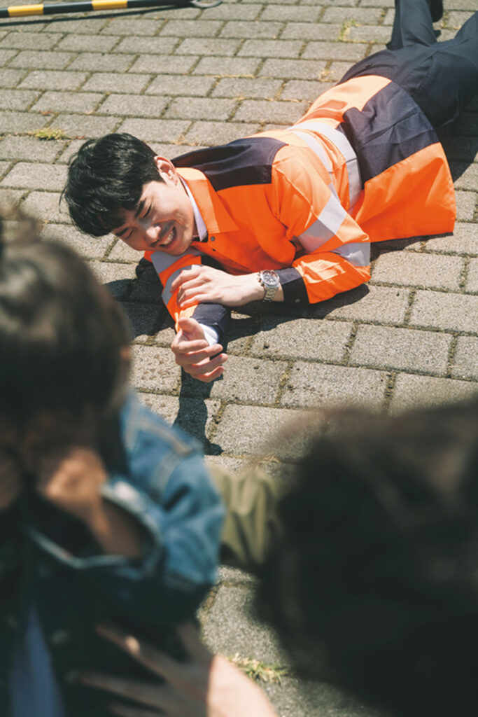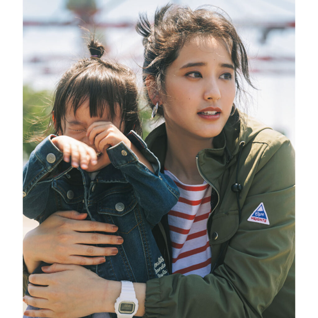 泣かないで、お姉ちゃんが絶対守ってあげるから。揺れが収まったらどこか安全な場所に…!バッグ¥58,300(ステート オブ エスケープ/サザビーリーグ)イヤリング¥8,640(アビステ)時計¥13,750(ジーショック/カシオ計算機 お客様相談室)