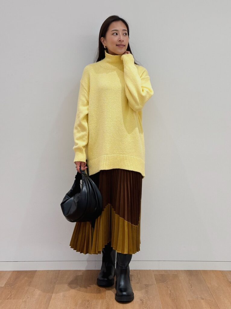ソフトニットハイネックセーター(長袖)¥3,990[Mサイズ着用]プリーツカラーブロックスカート¥5,990[Mサイズ着用]ボアフリーススタンドカラーコート¥6,990[Mサイズ着用]コンフィールタッチサイドゴアショートブーツ¥4,990[Mサイズ着用]レザータッチラウンドバッグ¥2,990(すべてユニクロ:シー/ユニクロ)