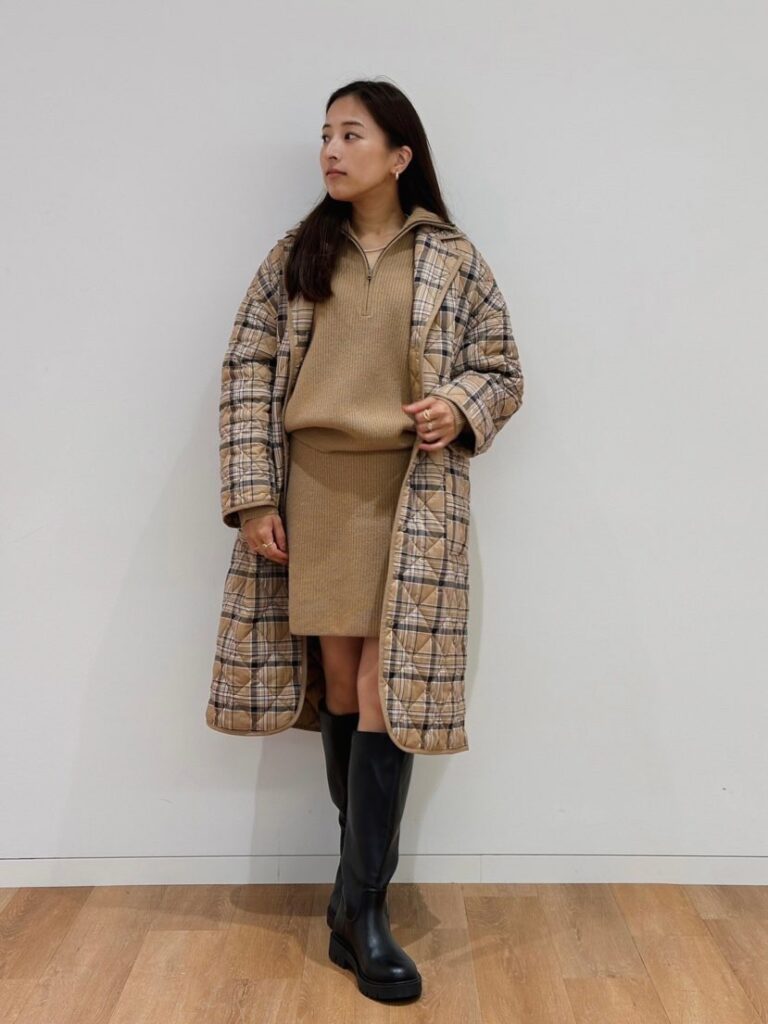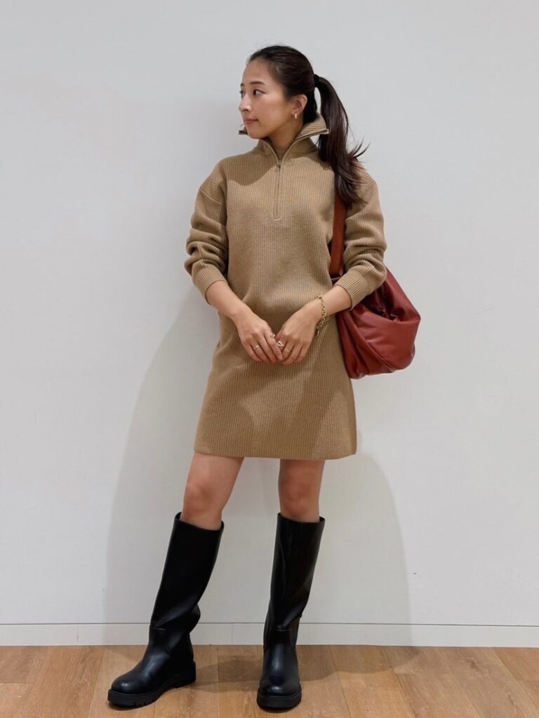 パフテックオーバーサイズコート¥12,900[Mサイズ着用]プレミアムラムハーフジップセーター(長袖)¥4,990[Mサイズ着用]プレミアムラムミニスカート¥2,990[Mサイズ着用]コンフィールタッチロングブーツ¥6,990 レザータッチラウンドバッグ¥2,990(すべてユニクロ:シー/ユニクロ)