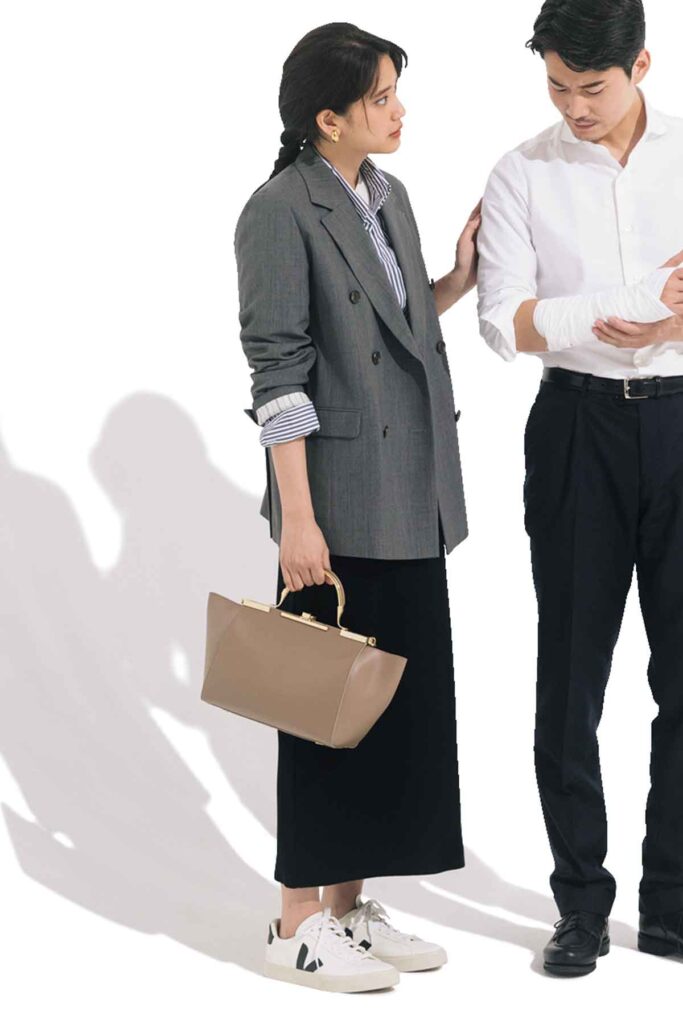 ストライプシャツ着回し スニーカー¥15,400(ナイキ スポーツウェア/NIKEカスタマーサービス)ロゴスウェット¥25,300(チャンピオン/ヘインズブランズ ジャパン カスタマーセンター)グレーセットアップ パンツ¥20,900(マイカ アンド ディール/マイカ アンド ディール 恵比寿店)バッグ¥8,250(バテンウェア/アリガインターナショナル)時計¥16,500(クルース/HIROB ルミネ新宿店)