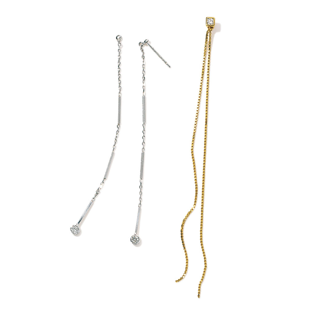 「目に留まり、気にならせることが大事なので、本能に訴えかける〝揺れる〟ジュエリーを。ロングのピアスなら女性らしさも加わって◎」儚げで繊細なデザインとは裏腹に、恋愛パワーは最高値!勝負ジュエリーを持っておくと、自分のスイッチにもなる。[左から]ピアス〈Pt×D〉¥48,400(ヴイエー ヴァンドーム青山/ヴイエー ヴァンドーム青山 有楽町マルイ店)シングルピアス〈K10YG×D〉¥41,800(Hirotaka/ヒロタカ 表参道ヒルズ)