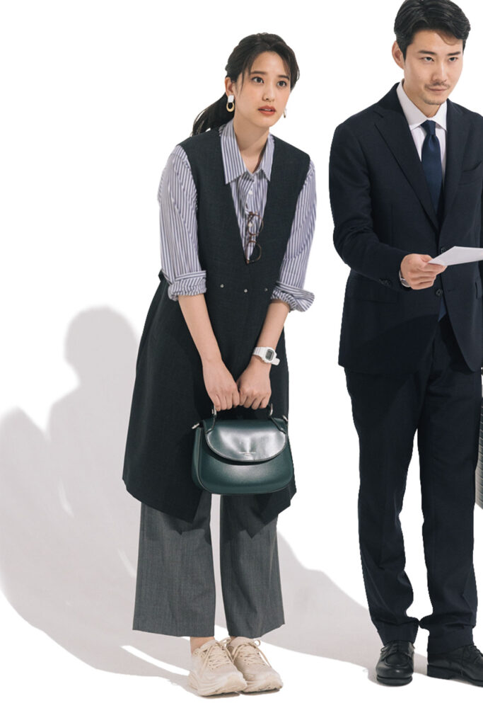 グレーセットアップ着回し ストライプシャツ¥2,990(UNIQLO)ジレ¥11,800(オリヒカ/オリヒカ池袋東口店)スニーカー¥20,900(ホカ®/デッカーズジャパン)バッグ¥85,800(ジャンニ キアリーニ/ジャンニ キアリーニ 銀座店)メガネ¥19,800(FURLA/デリーゴジャパン)イヤリング¥9,900(マージョリー・ベア/ココシュニック新宿タカシマヤ店)時計¥13,750(ジーショック/カシオ計算機 お客様相談室)