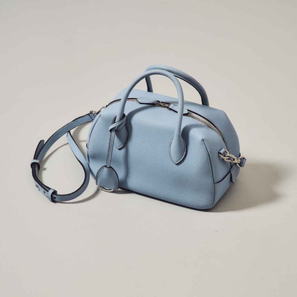 展示会でひときわ存在感を放っていた新色のアイスブルー。普段は黒バッグばかりに目が行きますが、華やかさと上品さを併せ持つ絶妙カラーに魅了されました。週3以上穿くデニムとの相性も抜群です。
