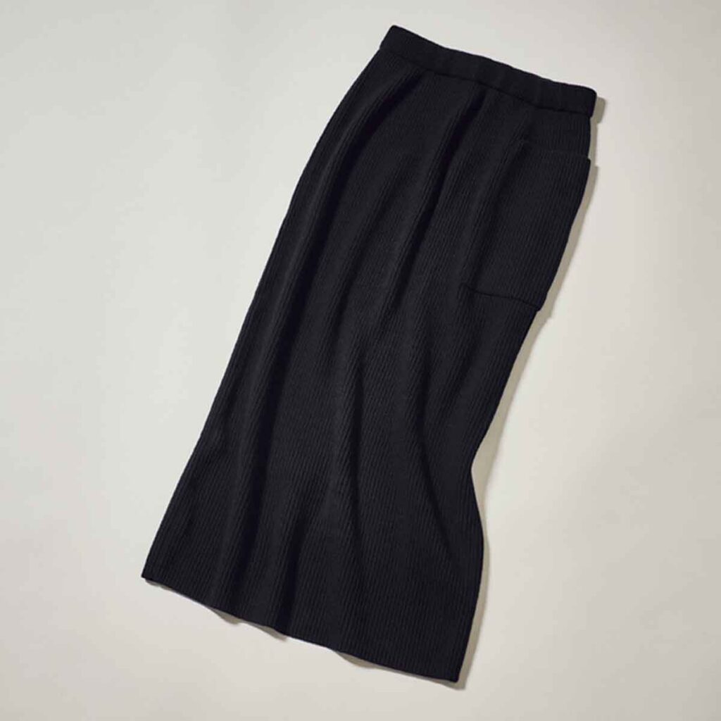 合わせやすく、スタイルアップもできるのでカジュアルな黒のタイトスカートが大好き。ATONのリブニットは締め付け感がなく楽ちんで、左についた大きめのポケットが普通すぎないワンポイントになって◎。