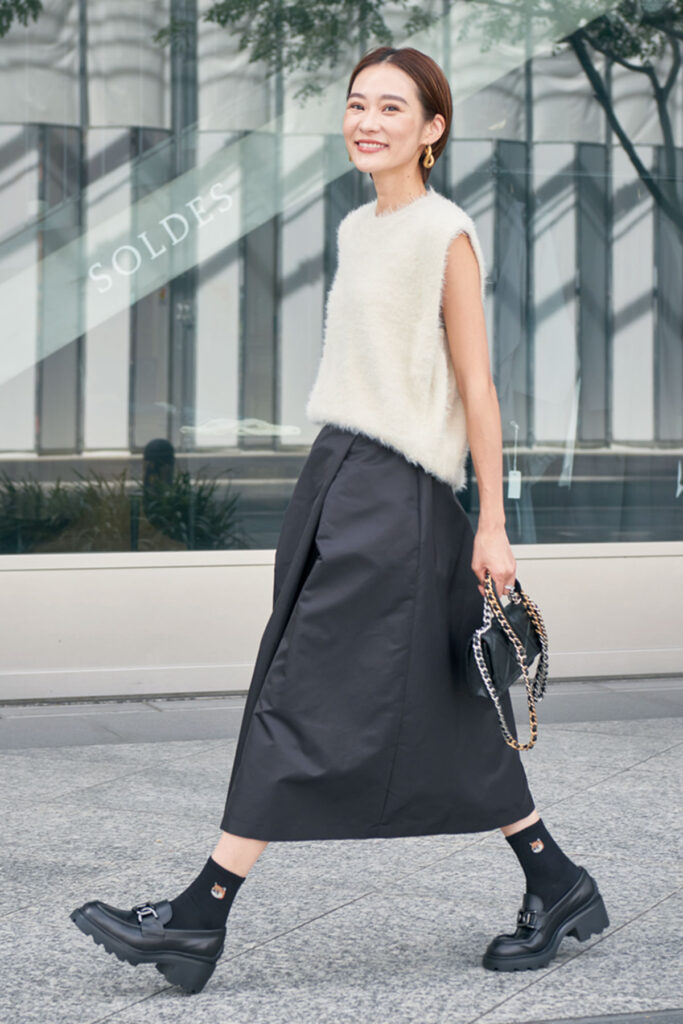 ふんわりニットとスカートのコーデには、ボリュームローファーを合わせることで、甘すぎず大人な印象にまとまります。