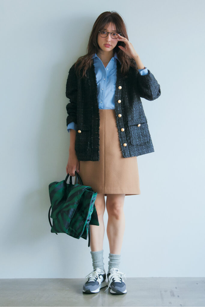 かっちりしすぎないブラックツイードは、ちょっとしたお出かけにもぴったり。ツイードジャケット¥24,200(スリースクエア)シャツ¥18,700(アルページュストーリー プレスルーム)スカート¥19,910(uncrave STANDARD/アンクレイヴ) 眼鏡¥41,800(アイヴァン/アイヴァン 東京ギャラリー)ネックレス¥37,400(マリハ)ソックス[3足セット]¥1,540(フルーツ オブザルーム/ギャレット)スニーカー¥10,340(ニューバランス/ニューバランス ジャパンお客様相談室)バッグ¥57,200(トフ&ロードストーン/T&L)