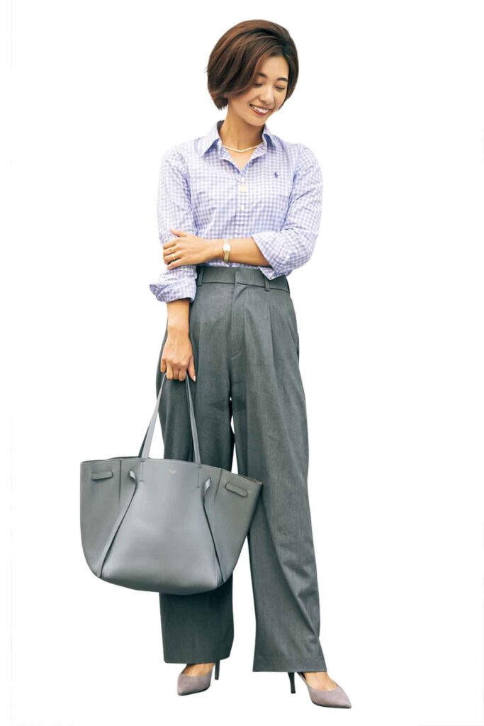 華やか配色のチェックシャツが通勤スタイルのちょうどいいハズし役