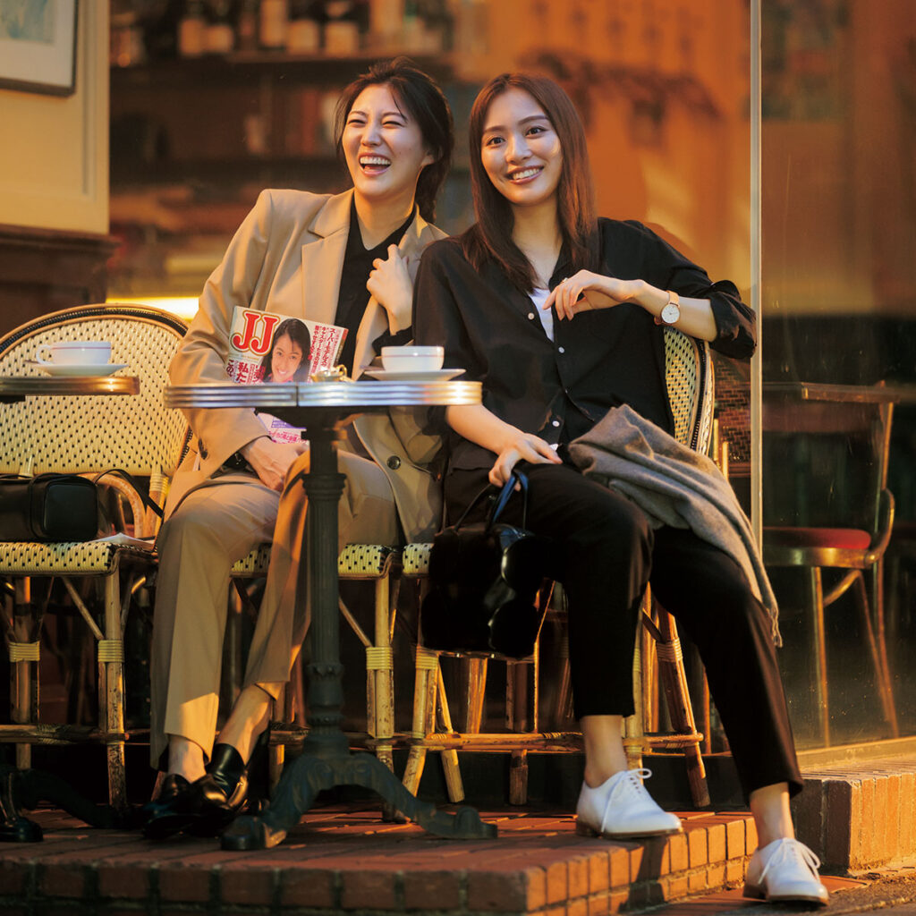 右〈内田さん/麻子〉シャツ¥39,600(フランク&アイリーン/サザビーリーグ)タンクトップ¥6,600(Theory/リンク・セオリー・ジャパン)パンツ¥7,150(ビーミング by ビームス/ビーミング ライフストア by ビームス ららぽーとTOKYO-BAY店)ストール¥88,000(ベグ アンド コー/ボーダレス)バッグ¥156,200(ピエール アルディ/ピエール アルディ 東京)シューズ¥126,500(ジェイエムウエストン/ジェイエムウエストン 青山店)時計¥17,160(クルース/HIROB ルミネ新宿店)リング¥9,900(ワンエーアールバイウノアエレ/ウノアエレ ジャパン)左〈岩﨑さん/夏子〉ジャケット¥53,900パンツ¥34,100(ともにTheory/リンク・セオリー・ジャ パン)ニット¥10,000(バナナ・リパブリック)バッグ¥39,600(オルセット/オルサ)ローファー¥132,000(ピエール アルディ/ピエール アルディ 東京)