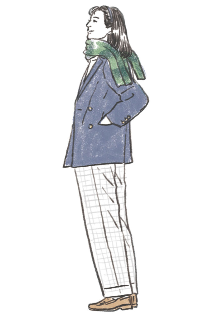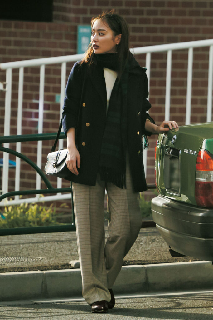 ジャケット¥69,300(クチュール ド アダム/ホワイトオフィス)ニット¥31,900(ユニオン ランチ/サザビーリーグ)パンツ¥17,000(バナナ・リパブリック)ストール¥75,900(Johnstons of Elgin/BRITISH MADE 銀座店)カチューシャ¥14,300(アレクサンドル ドゥ パリ/アレクサンドル ドゥ パリ GINZA SIX店)バッグ¥39,600(TOFF&LOAD STONE/T&L)ローファー¥137,500(ジェイエムウエストン/ジェイエムウエストン 青山店)イヤリング¥121,000(ウノアエレ/ウノアエレ ジャパン)
