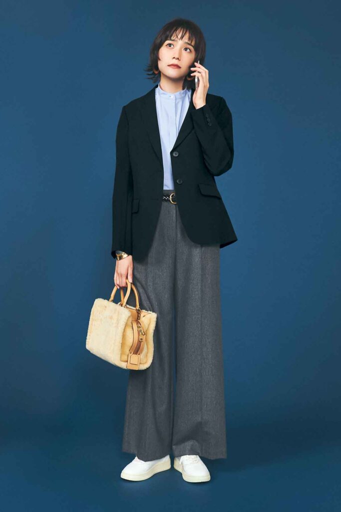 オフィカジ必須アイテムのグレーパンツは、真面目に着すぎないのがあか抜けのポイント。
