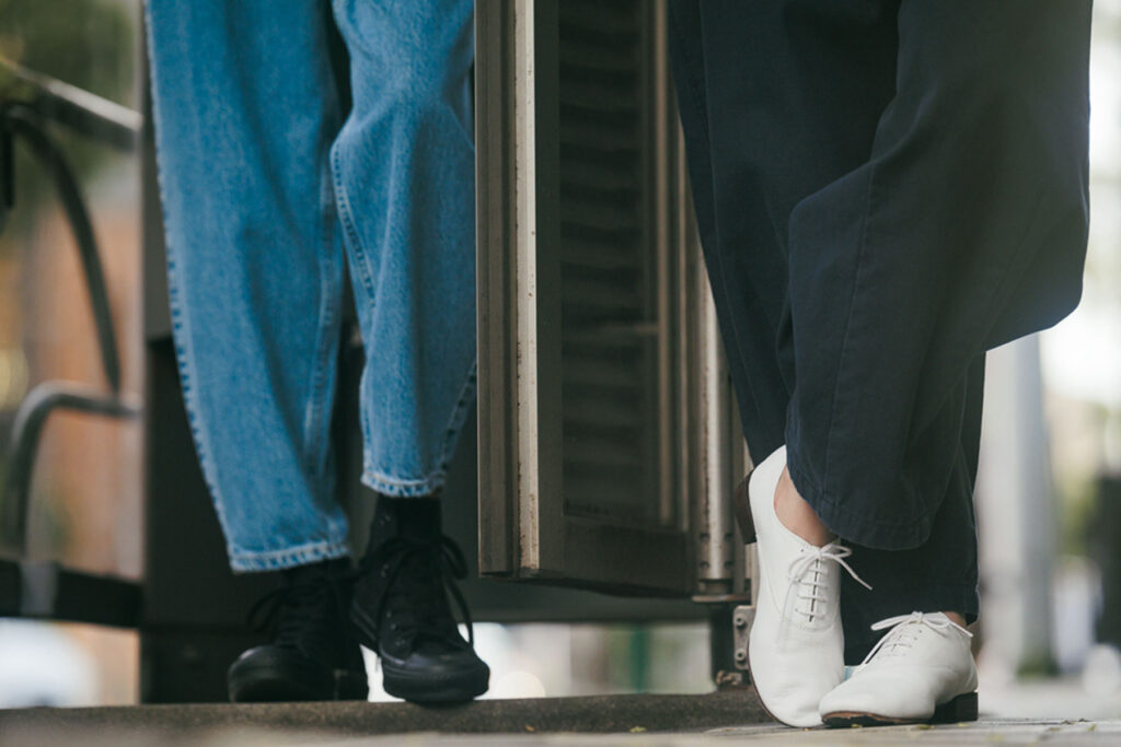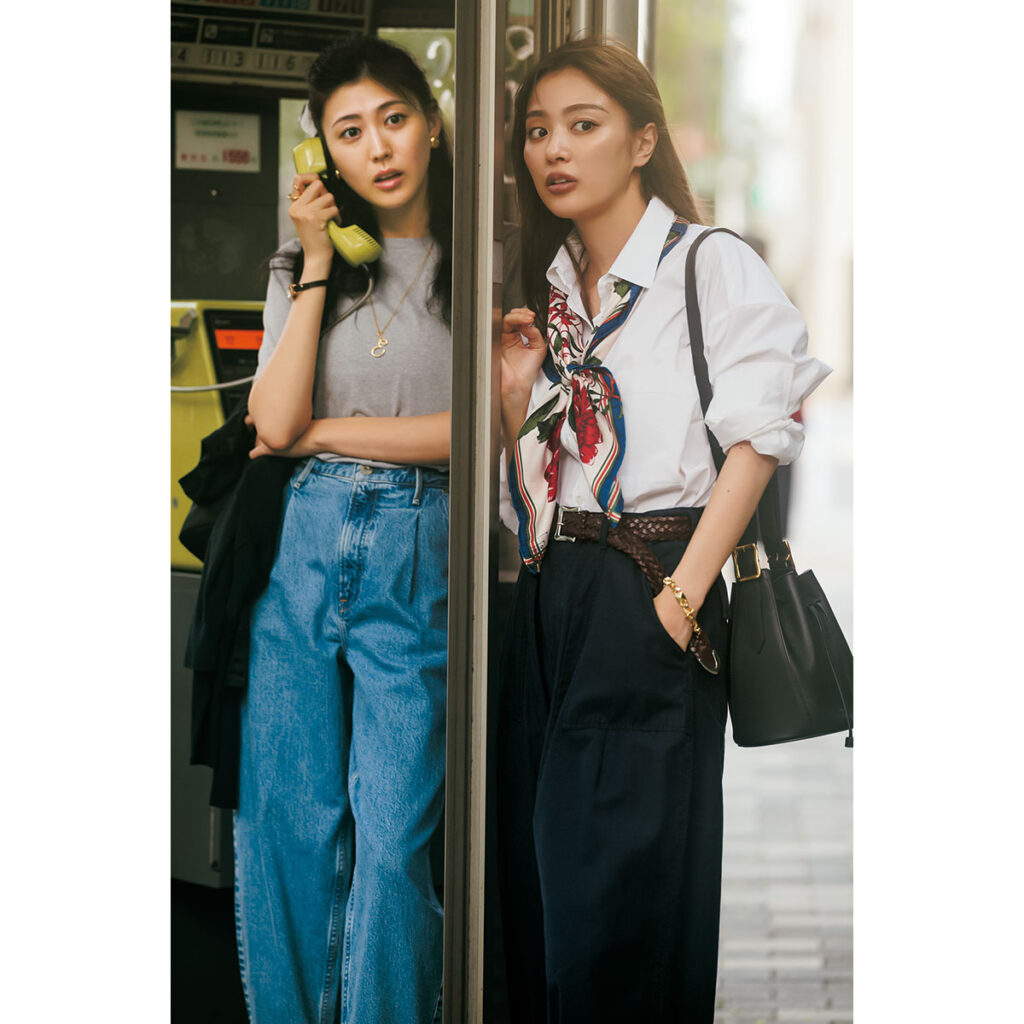右〈内田さん/麻子〉シャツ¥26,400(ウィム ガゼット/ウィム ガゼット ルミネ新宿店)パンツ¥28,600(RHC/RHC ロンハーマン)ベルト¥42,900バッグ¥165,000(ともに J&M デヴィッドソン/J&M デヴィッドソン カスタマーセンター)スカーフ¥19,800(マニプリ)シューズ¥58,300(レペット/ルック ブティック事業部)ブレスレット¥23,100(ワンエーアールバイウノアエレ/ウノアエレ ジャパン)左〈岩﨑さん/夏子〉Tシャツ¥10,500(テイクス/シンゾーン 表参道本店)カーディガン¥45,100(ジョン スメドレー/リーミルズ エージェンシー)デニムパンツ¥27,500(アッパーハイツ/ゲストリスト)スカーフ¥15,400(マニプリ)スニーカー¥6,380(コンバース/コンバースインフォメーション センター)イヤリング¥5,250(アビステ)ネックレス¥12,100〈エイチアッシュ〉リング¥14,300〈イン ムード〉(ともにフォーティーン ショールーム)時計[フェイス]¥24,200時計[ベルト]¥13,200(ともにマトウ/エイチエムエスウォッチストア 表参道)