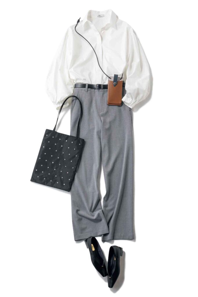 ボウタイシャツ着回し ワイドパンツ¥13,900(Gap)スマホショルダー¥57,200(J&M デヴィッドソン/J&Mデヴィッドソン カスタマーセンター)PCバッグ¥7,700(アビステ/買えるCLASSY.)パンプス¥14,300(ル タロン グリーズ/ル タロン グリーズ ルミネ新宿店)ベルト¥2,990(UNIQLO)