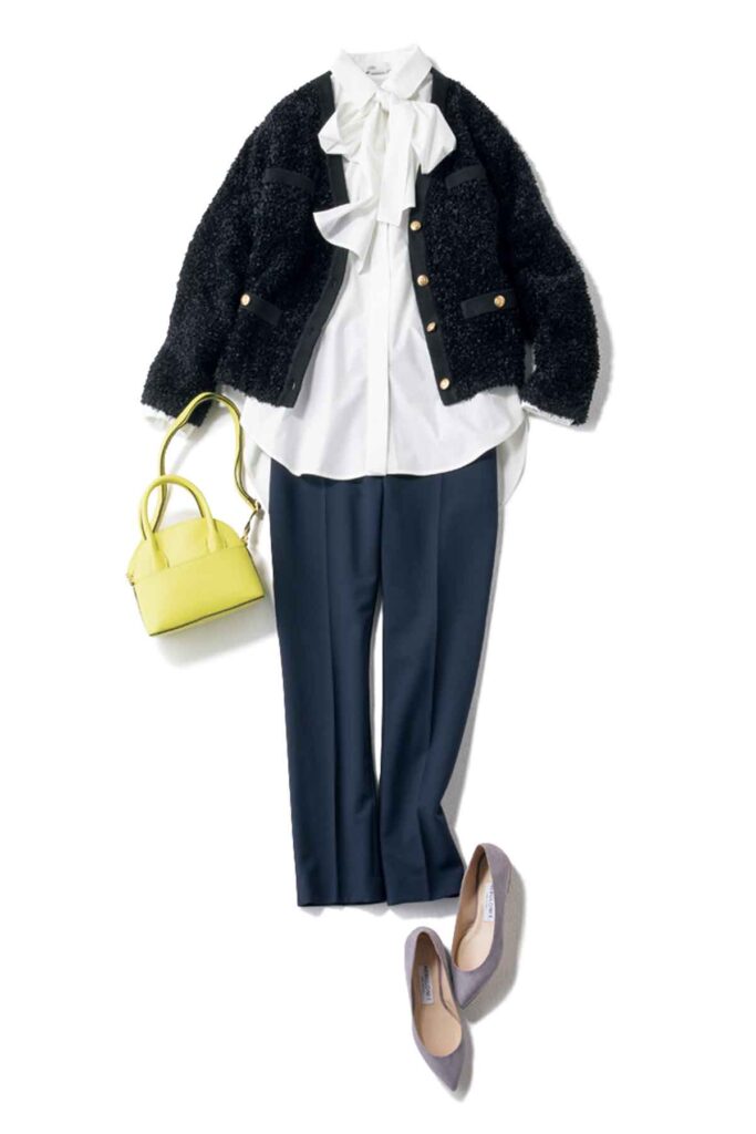 ボウタイシャツ着回し テーパードパンツ¥9,990(PLST)ツイード調カーデ¥24,200(ジャスグリッティー/ジャスグリッティー プレスルーム)バッグ¥18,700(メゾン ヴァンサン/フラッパーズ)パンプス¥53,900(ネブローニ)