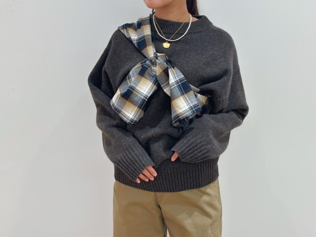 シルエットデザインが活きるシンプルなスタイリング。ゆったり×ゆったりのコンビネーションでも、ニットのリブやパンツのカーブによりメリハリのある仕上がりに。それぞれのカラーを拾ったチェック柄シャツのたすきがけで、全体に統一感を持たせて。