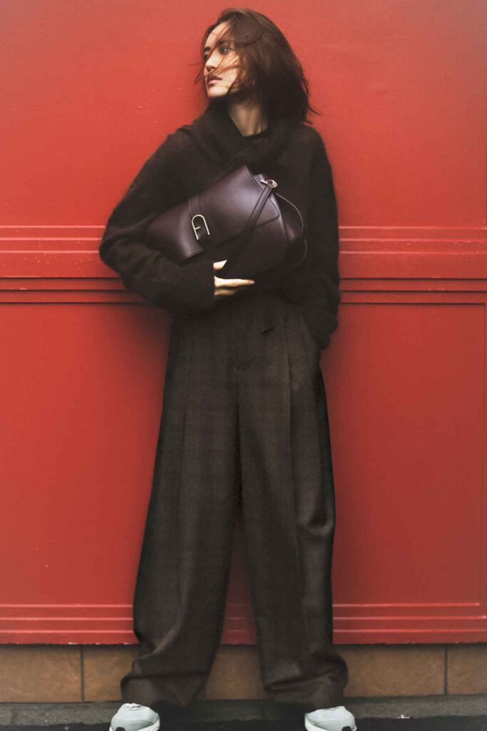 柄や生地はトラッド、形はモードなパンツは、美恵さんもお買取り予定。パンツ¥22,000(バナナ・リパブリック)ニット¥34,100ストール¥14,300(ともにエブール/エブール GINZA SIX店)バッグ¥106,700(フルラ/フルラ ジャパン)ベルト¥15,400(ウィム ガゼット/ウィム ガゼット ルミネ新宿店)ピアス¥19,800(マリア ブラック/マリア ブラック 表参道店)スニーカー¥19,800(ニューバランス/ニューバランスジャパンお客様相談室)