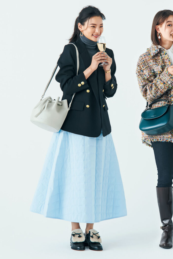 リッチな空間と気分を楽しみたい日は、冒険しすぎない正統派のコーデが賢い選択。ジャケット¥75,900(カバナ/アマン)ニット¥31,900(スローン/ザ ショップ スローン 新静岡セノバ店)スカート¥35,000(シーニュ)バッグ¥171,600シューズ¥115,500(ともにJIMMY CHOO)ピアス¥4,860バングル[手首側から]¥8,640 ¥10,290 ¥9,450(すべてアビステ)