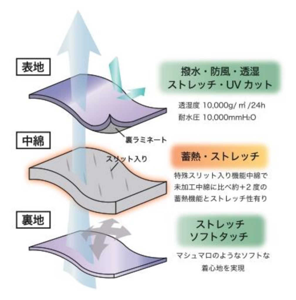 耐水圧20000mmH2O、透湿度20000g/m²/24h。赤外線サーマルわた使用で、+6°Cの保温性を実現。