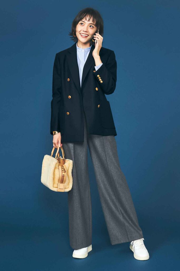 ニット¥2,990(UNIQLO)コート¥96,800(ハイク/ボウルズ)パンツ¥20,900(マイカ アンド ディール/マイカ アンド ディール 恵比寿店)バッグ¥86,900(コーチ/コーチ・カスタマーサービス・ジャパン)ストール¥62,700(アソース メレ/アイネックス)スニーカー¥24,200(コンバース/コンバースインフォメーションセンター)ネックレス¥18,920(エムシー・スタジオ/ZUTTOHOLIC)ブレスレット¥9,900(イン ムード/フォーティーン ショールーム)時計¥17,160(クルース/HIROBルミネ新宿店)