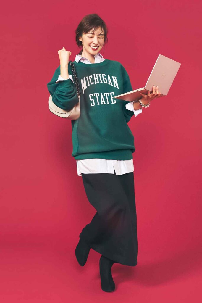 スウェット¥26,400(チャンピオン/ヘインズブランズ ジャパン カスタマーセンター)シャツ¥29,700(ティッカ)スカート¥18,920(ネイヴ/オンワード樫山)バッグ¥75,900(ジャンニ キアリーニ/ジャンニ キアリーニ 銀座店)ブーツ¥46,200(銀座かねまつ/銀座かねまつ6丁目本店)ブレスレット¥52,800(バルブス/ZUTTOHOLIC)時計¥24,200ストラップベルト¥4,400(ともにマトウ/エイチエムエスウォッチストア表参道)