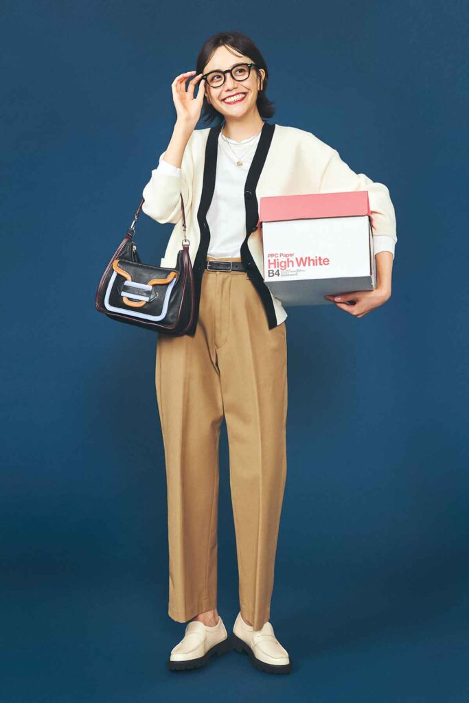 カーディガン¥30,800(アンタイトル)カットソー¥11,550(スローン/ザ ショップ スローン 新静岡セノバ店)パンツ¥20,900ベルト¥9,680(ともにザ シンゾーン/シンゾーン ルミネ新宿店)バッグ¥174,900(ピエール アルディ/ピエール アルディ 東京)シューズ¥27,500(カミナンド/グラビテート)メガネ¥36,300(アイヴァン/アイヴァン 東京ギャラリー)ボールネックレス¥19,800(バルブス/ZUTTOHOLIC)コインネックレス¥19,800(マリハ)