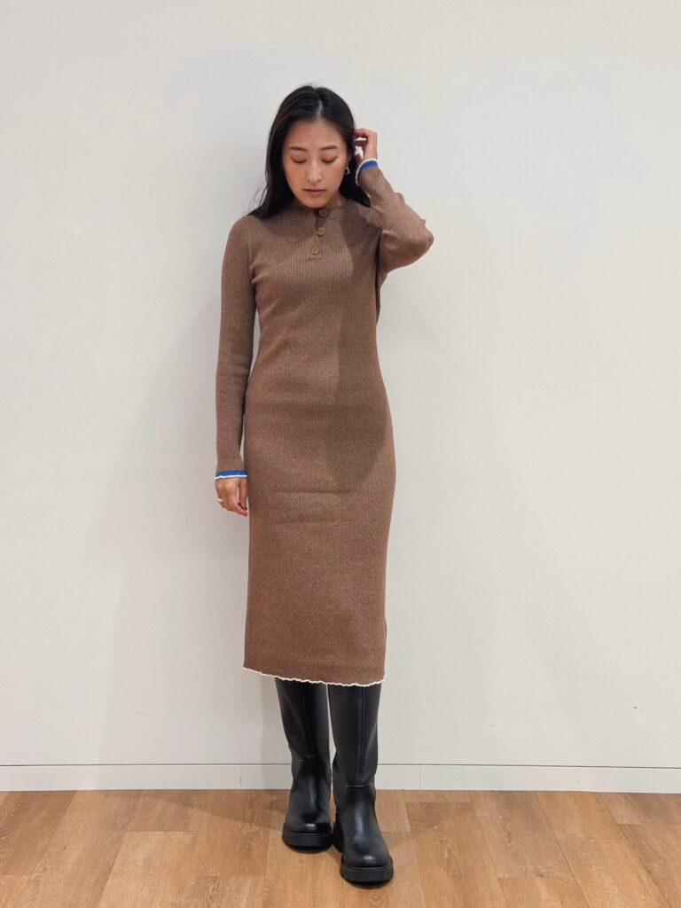 トレンチコート¥12,900[MEN Sサイズ着用]リブニットワンピース¥5,990[Mサイズ着用](ともにユニクロ アンド ジェイ ダブリュー アンダーソン/ ユニクロ)コンフィールタッチロングブーツ¥6,990(ユニクロ:C/ユニクロ)