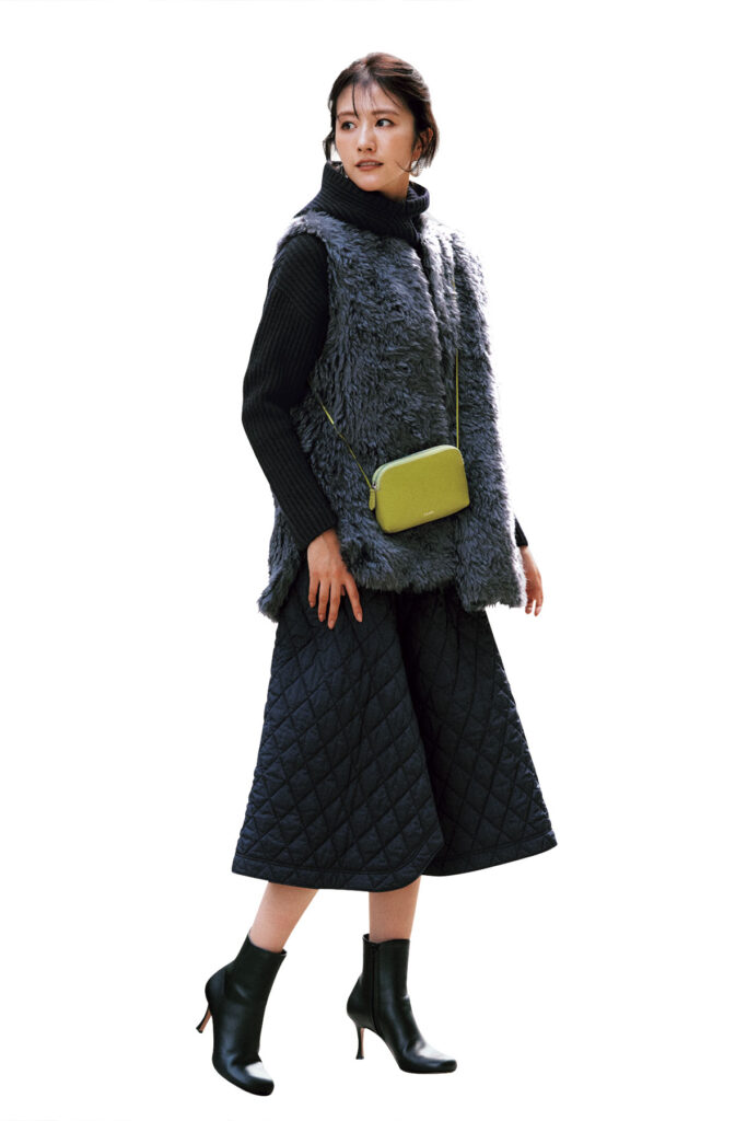 ダウンベスト¥156,200(カナダグース)ニット¥30,800(バトナー×デミルクス ビームス/デミルクス ビームス新宿)パンツ¥23,100(アルページュ ストーリー/アルページュ ストーリー プレスルーム)バッグ¥24,200(マルコマージ/プルミエ アロンディスモン)ブーツ¥28,600(ダイアナ/ダイアナ銀座本店)マフラー¥35,200(トラディショナル ウェザーウェア/トラディショナル ウェザーウェア ルミネ有楽町店)ピアス¥33,440(バルブス/ZUTTOHOLIC)