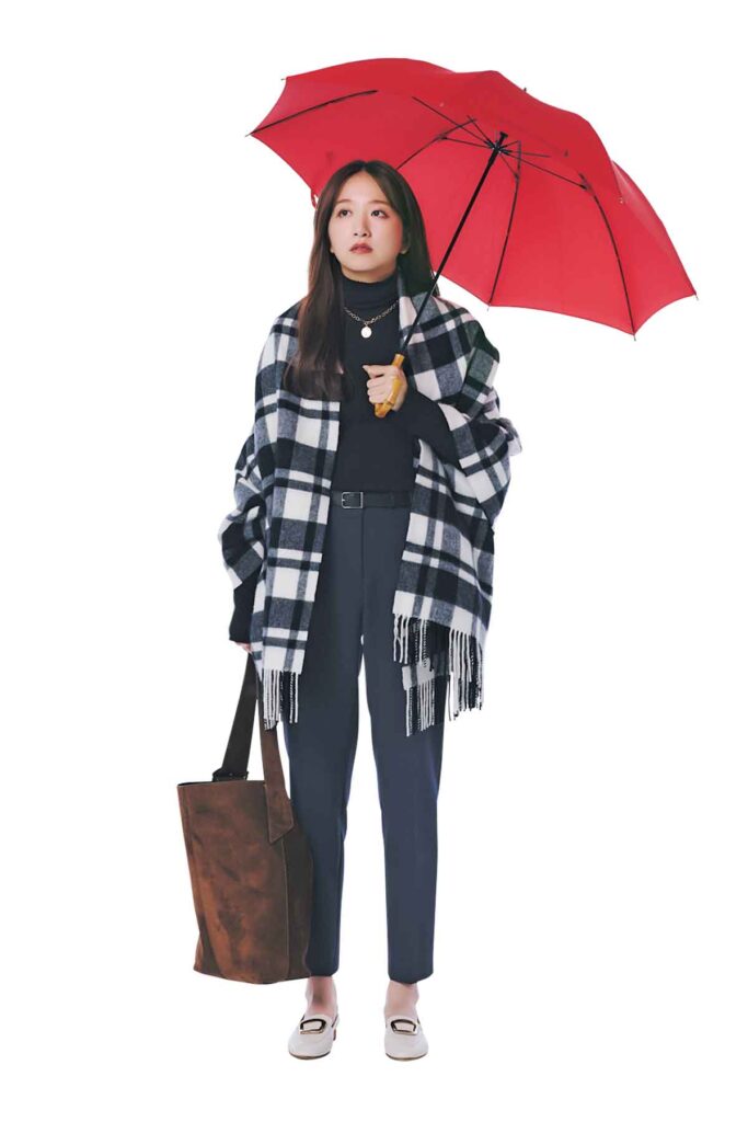 タートルリブニット着回し フレアパンツ¥22,000(LE PHIL/LE PHIL NEWoMan 新宿店)ボウタイシャツ¥25,300(ダブルスタンダードクロージング/フィルム)バッグ¥50,000(バナナ・リパブリック)ブーツ¥30,800(ダイアナ/ダイアナ 銀座本店)傘¥18,700(マッキントッシュ/マッキントッシュ ギンザシックス店)
