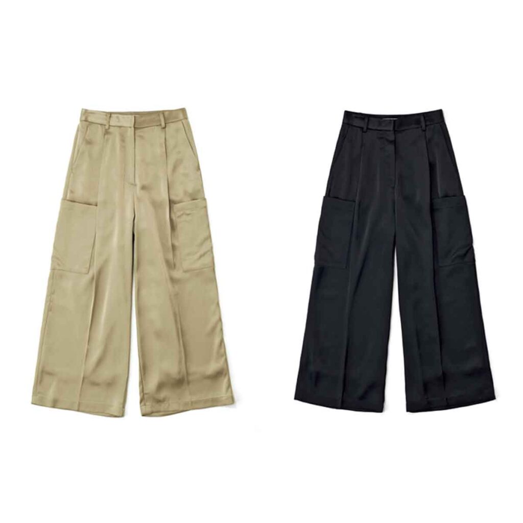 『今季はふわふわ素材が外せないトレンド。CLASSY.コーデにハマる2色をオーダ ーしました。新ベーシックアイテムでもあるカーゴパンツは、サテン素材でメンズっぽくならず、キレイにはけます。』