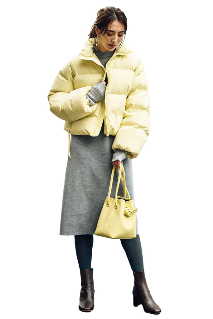 ぱっと華やぐヒヨコ色のダウンと巾着バッグで、手持ち服が見違える!