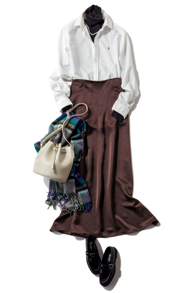 オックスフォードシャツ着回し リブタートルニット¥2,990(UNIQLO)サテンスカート¥18,920(リネイヴ/ネイヴ)バッグ¥45,100(ヴァジック/ヴァジックジャパン)ストール¥75,900(ジョン ストンズ オブ エルガン フォー ユナイテッドアローズ/ユナイテッドアローズ 渋谷スクランブルスクエア店)ローファー¥33,000(銀座かねまつ/銀座かねまつ6丁目本店)ネックレス¥14,850(エイチアッシュ/フォーティーン ショールーム)
