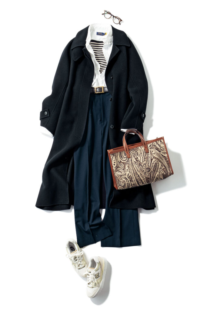 オックスフォードシャツ着回し ピンタックパンツ¥13,090(ザ・スーツカンパニー/スーツスクエア TOKYO GINZA店)ボーダーカットソー¥13,200(ルミノア/ゲストリスト)ロングリバーコート¥75,900(デミルクス ビームス/デミルクス ビームス 新宿)バッグ¥55,000(ア ヴァケーション/ノーベルバ)スニーカー¥18,700(ニューバランス/ニューバランスジャパンお客様相談室)ベルト¥25,300[参考価格](アトリエ アンポワーズ/アマン)メガネ¥36,300(アンティミテ バイ アイヴァン/ミス シープアイヴァン ニュウマン 新宿)