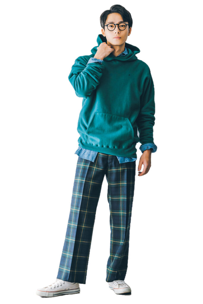 目を引く鮮やかなグリーンに、秋らしい同系色のチェック柄パンツを合わせて端正なムードに。袖口や裾からダンガリーシャツを覗かせて、メリハリをプラス。足元は白スニーカーで気負いなく。フーディ(女性モデルと同じ)シャツ¥35,200チェック柄パンツ¥147,400(ともにマディソンブルー)メガネ¥42,900(モスコット/モスコット トウキョウ)シューズはスタイリスト私物