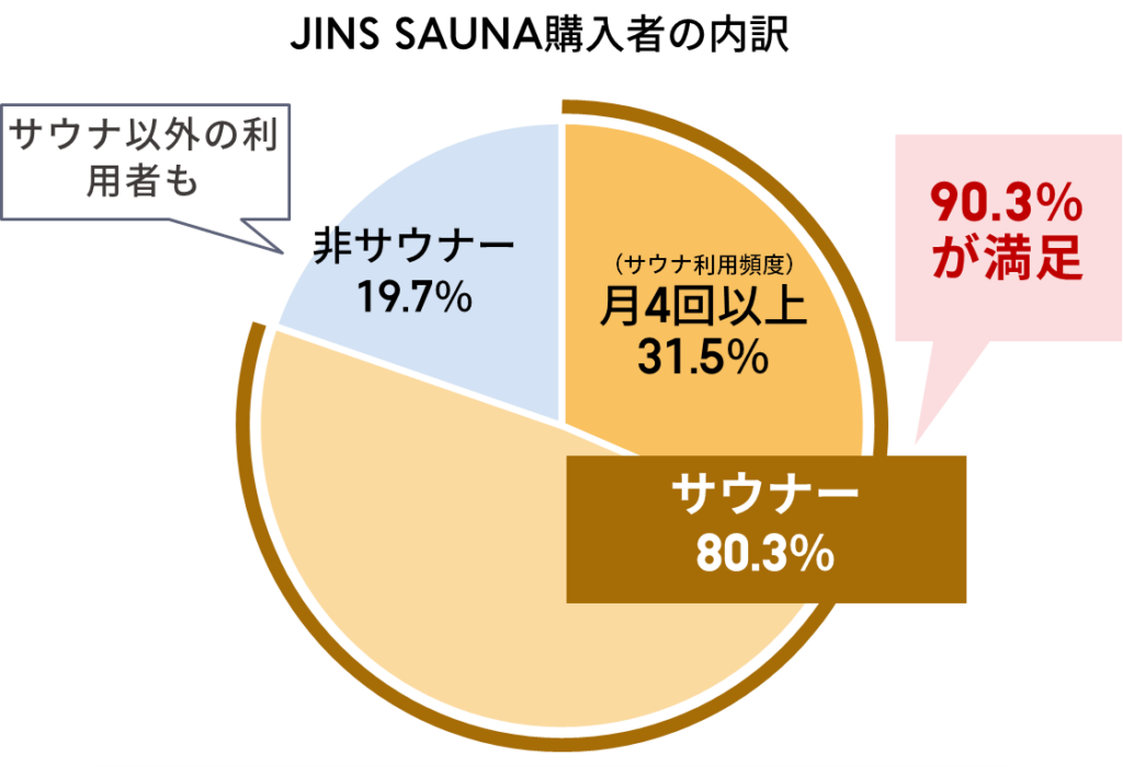 2023年2⽉6⽇に発売した「JINS SAUNA」は、フレームもレンズも耐熱温度120℃を実現!くもりにくく、濡れても錆びにくい仕様です。⽇常使いできるデザインにこだわり、乱視や左右差にも対応して普段使用する度数で作成できるため、思い⽴ったらすぐサウナに⾏けると、サウナーの⼼をつかみました。メイン購⼊者は30〜40代男性。折しも新型コロナウイルスの5類移⾏によるサウナ解禁ムードの⾼まりも受け、その売上げは、同年代購⼊者で1位※となりました。※2023年上半期 JINS 新作メガネ総売上⾦額∕男性30〜40代JINS APP会員向けに⾏った購⼊者アンケートでは、8割がサウナ―であることが判明。購⼊後の満⾜度も⾮常に⾼く、⽉に4回以上サウナに⾏くヘビーサウナ―のうち90.3%の⽅が商品に対して「満⾜」と回答。TTNE 株式会社が発表する「Saunner of the Year(サウナ―オブザイヤー) 2023」では JINS SAUNA の開発が評価され、企業では今年唯⼀選出されるなどサウナ界での熱い⽀持を得ています。また、実はサウナ以外でも活⽤されていることがわかっており、銭湯や旅先の⾵呂、⾃宅での⻑⾵呂スマホ、⼦どもの⼊浴の世話、⼊浴介助などの⼊浴シーンから、マスク着⽤時、熱いものを⾷べるときまで⽇常の様々なシーンで活躍することも⼈気の理由となっています。