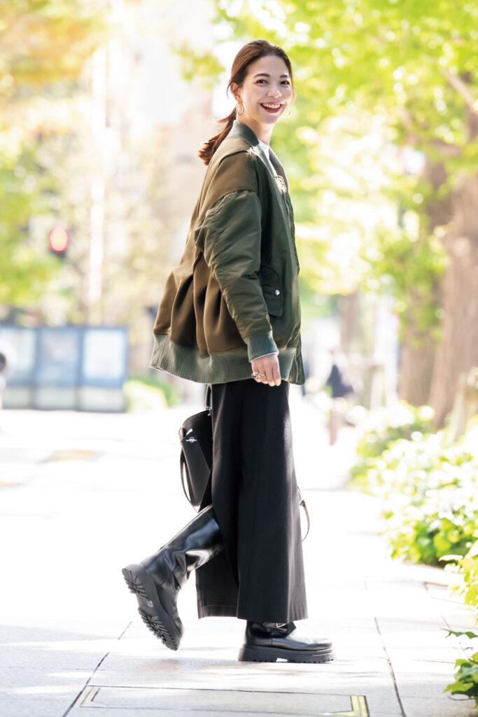 昔から渋色が好きですが、中でもカーキはダントツ!メンズ感が強いアウターは、スカートやワンピで中和させます。