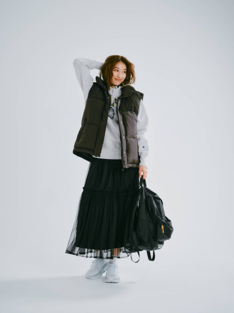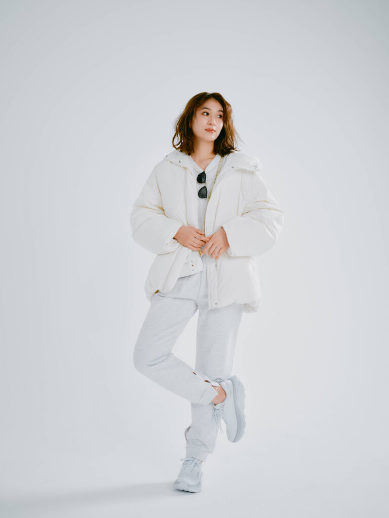 本企画のモデル、スニーカー好き・有末麻祐子さんは「白のホカは2足持っています!ぼてっとしたシルエットはブーツっぽく履けます。全身白のスウェットコーデで、スポーティにまとめたい気分」と実際に履いてみてコメント。