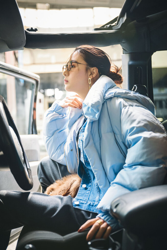 パンツ¥36,300(ロエフ/エイチビューティー&ユース)ダウンジャケット¥88,000(パッド/エストネーション)デニムジャケット¥27,500〈アルアバイル〉スニーカー¥39,600〈デイト〉(ともにアルアバイル) Tシャツ¥15,400(エイトン/エイトン青山)眼鏡¥37,400(アイヴァン/アイヴァン東京ギャラリー)ピアス¥11,000 リング¥13,200(ともにワンエーアールバイウノアエレ/ウノアエレジャパン)バッグ¥39,600(カルス/アマン)